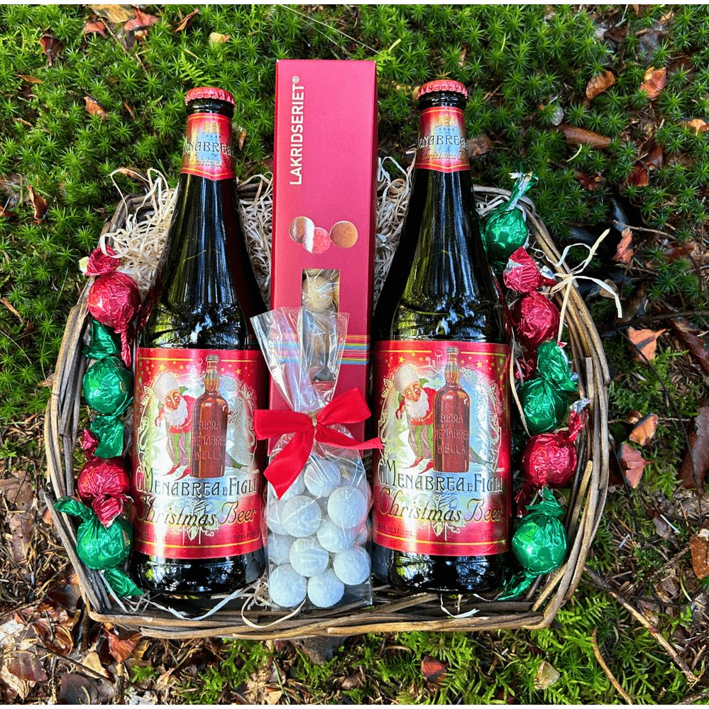 Denne stemningsfulde julekurv er perfekt til ølentusiasten og til dem, der elsker en god blanding af juleøl og søde fristelser. Gavekurven er flot arrangeret og vil være en oplagt gaveidé til jul, hvad enten den skal gives som værtindegave, til familie eller kolleger.Der kan ske variation i kurvens indhold af søde sager, udfra aktuelle julegodter på lager.Kurven kan eksempelvis indeholde følgende lækkerier:2 flasker Menabrea Christmas Ale – Denne italienske juleøl fra Menabrea bryggeriet byder på en flot ravfarve og har en rig og krydret smag, der passer perfekt til vinterens hyggestunder. Menabrea Christmas Ale er brygget med særligt udvalgte ingredienser og har en kompleks smagsprofil, som gør den til en populær juleøl. Nyd den alene eller sammen med en god julemiddag.Fyldte chokoladekugler – Lækre chokoladekugler med fyld, der tilføjer en sød og luksuriøs smagsoplevelse. Kuglerne er pakket i røde og grønne folieindpakninger, som bidrager til den festlige julestemning i kurven.Lakridskugler fra Lakridseriet – En delikat pakke med lakridskugler fra Lakridseriet, kendt for deres udsøgte smagskvalitet og unikke smagskombinationer. Disse kugler er perfekte som en lille snack og vil med sikkerhed glæde enhver lakridselsker.Mini snebolde – Sprøde, sukkerdækkede mini snebolde, der minder om klassiske juleslik. Perfekt som en sød afslutning på måltidet eller til at dele med familie og venner i juletiden.Denne gavekurv er perfekt til at skabe julestemning og forkælelse, og passer både til hyggelige aftener derhjemme og som en personlig julegave til øl- og chokoladeelskere.