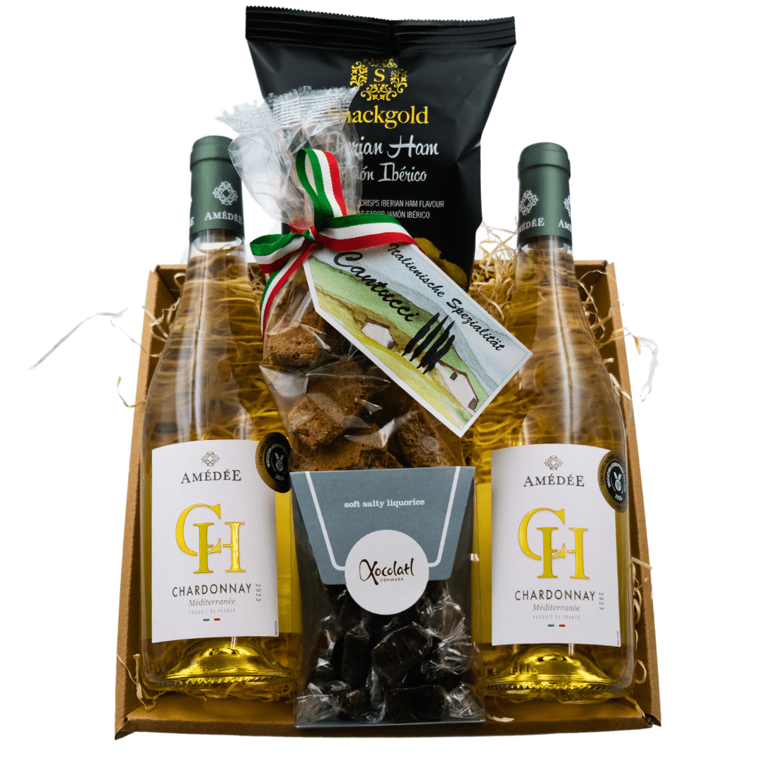 En oplagt gavekurv til hvidvinselskeren, livsnyderen eller som en elegant værtindegave med lidt af det hele.