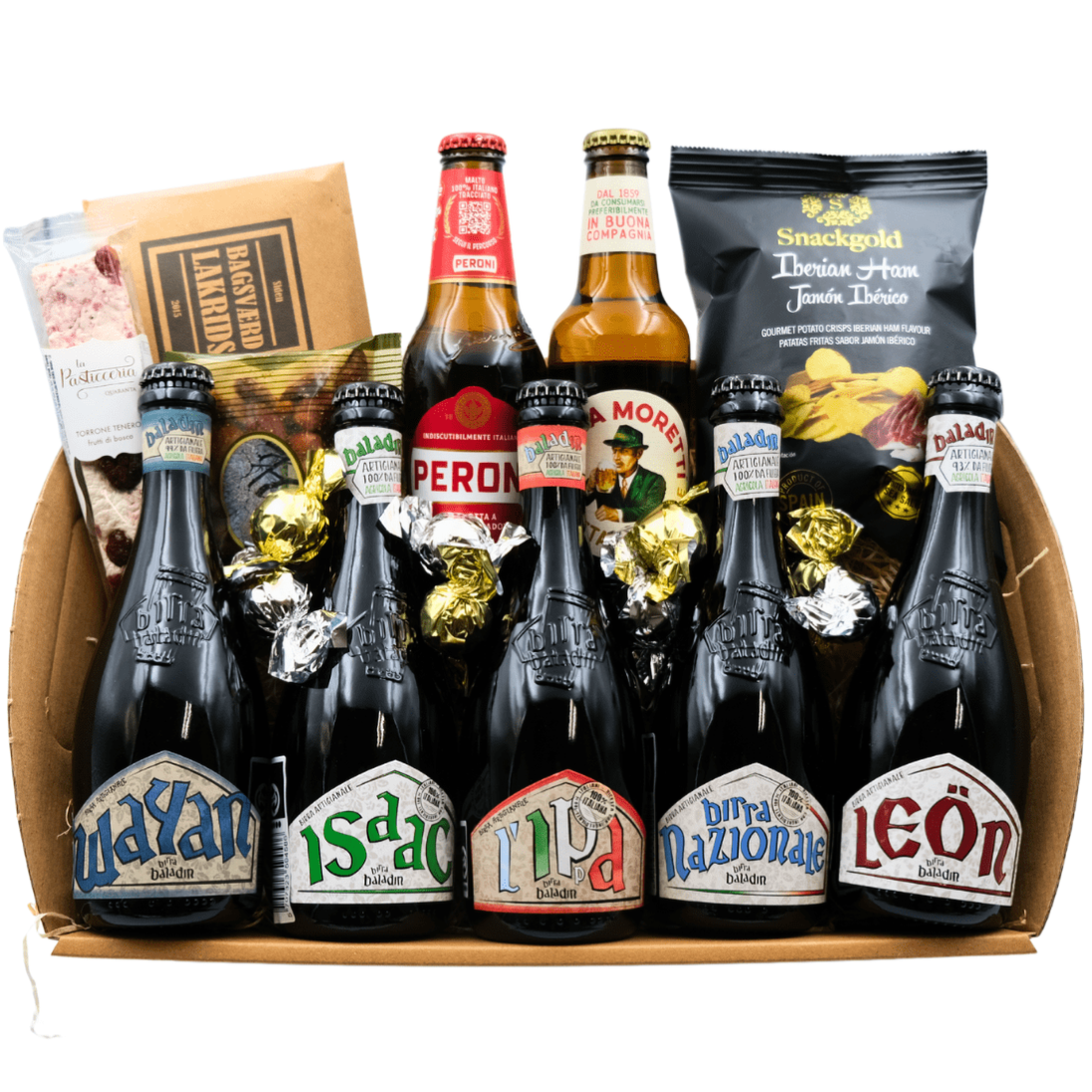 En kurv for feinschmeckeren, der elsker variation, smagsdybde og det bedste fra både italiensk mikrobryg og danske specialiteter. Med fem forskellige Baladin-øl, klassiske italienske pilsnere og delikate snacks er denne gavekurv en komplet smagsrejse – perfekt til enhver anledning, hvor kvalitet skal fejres.