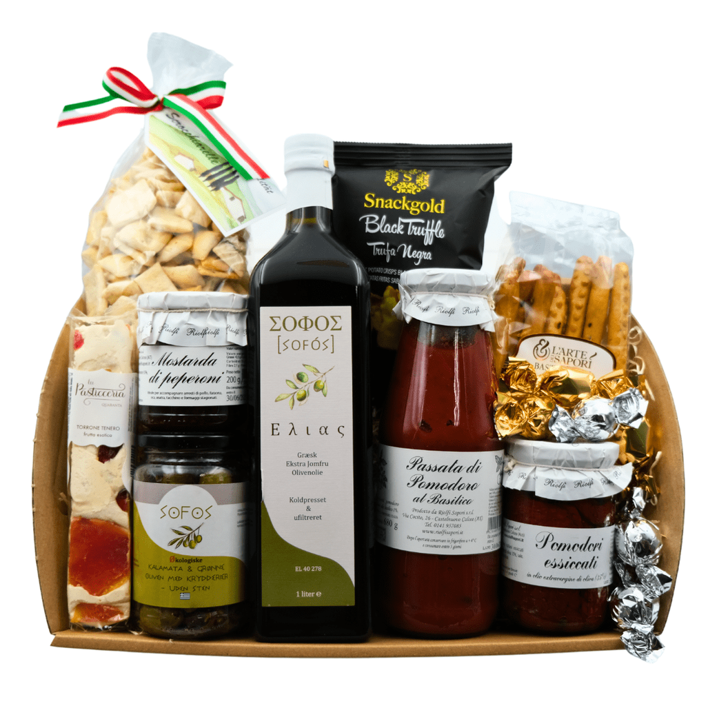 En overdådig gavekurv fyldt med autentiske smage fra Middelhavet – både fra Italiens landkøkken og Grækenlands solrige marker. Kurven er spækket med delikatesser, der passer perfekt til tapasbordet, gave til madelskeren eller som eksklusiv værtindegave.